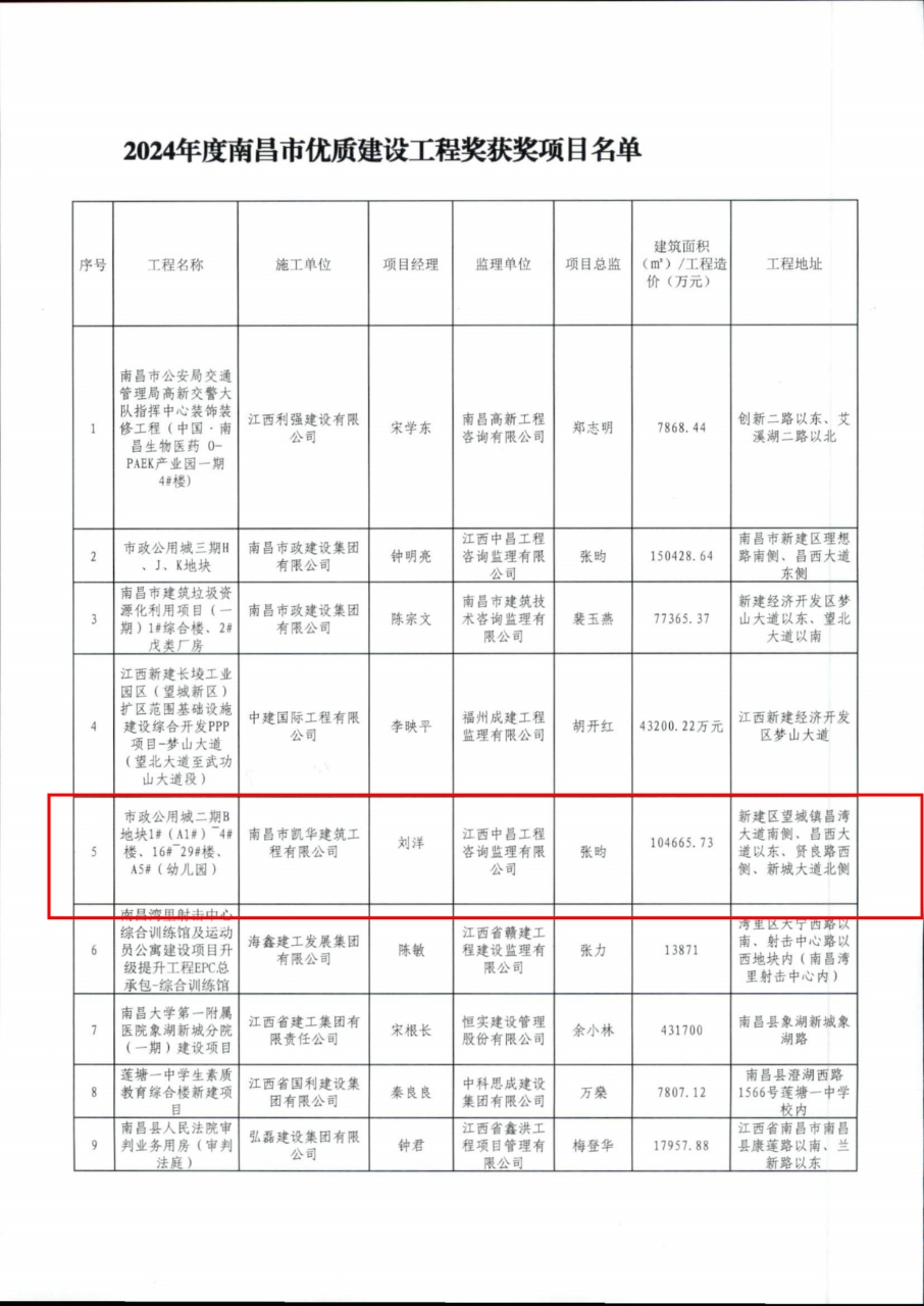 2025年7月4日,南昌市凱華建筑工程有限公司承建的南昌市政公用城二期1#(A1#)-4#樓、16#-29#樓、A5#(幼兒園)、紅谷灘“北外灘”鳳凰公交樞紐站共2個(gè)項(xiàng)目,獲評(píng)2024年度南昌市優(yōu)質(zhì)建設(shè)工程獎(jiǎng)。